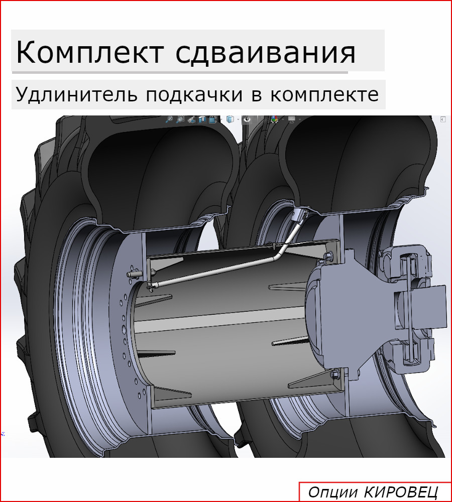 Сдваивание колес применяется для увеличения площади контакта колес с опорной поверхностью и снижения удельного давления на почву. Описание комплектаций: 743-47.10.000 (без колес): 4 проставки-барабана с комплектом крепежа барабана к водилу моста и крепежа дополнительных колес.